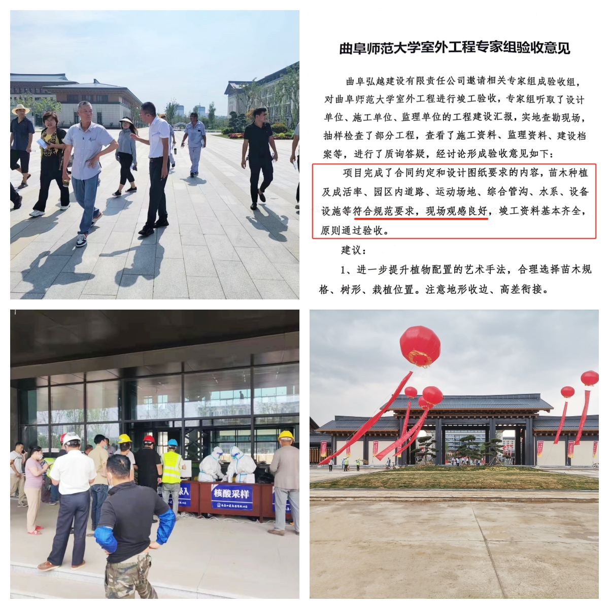 没有条件创造条件也要上,工程完工后一次性通过验收。本工程2022年9月主要工作量已基本完工,其间疫情防控4次封闭工地场区,合计长达3月之久,人员、物资流动受限,所有施工活动无法有效开展,工地进度迟缓不前。非常时期非常之举,项目组眼睛向内,自我突破,不管是测量放样专技人员、还是项目管理人员,全体员工自己动手,砌筑雨污水井道、埋设雨污水管道,匠心造人,共克时艰,让人刻骨铭心。